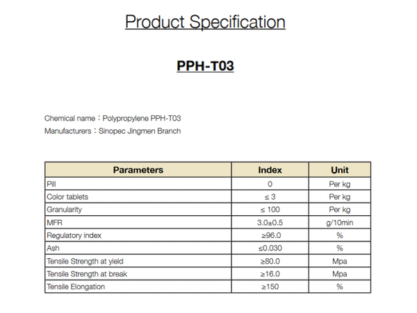 – Thông số kỹ thuật của hạt nhựa PP Yarn PPH-T03: